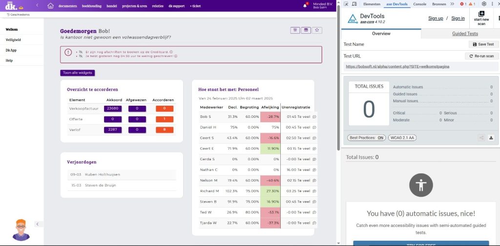 - Er is nog 1 issue, css gerelateerd. Dit betreft een element voor waarschuwingen die nog niet het gewenste contrast heeft. Dit element zit wat diep verscholen maar wordt nog opgelost. Het betreft WCAG criterium 1.4.3. en 4.1.3.